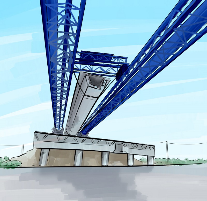 架橋機架設(shè)末跨橋時,對面是橋臺,架橋機前支腿必須在橋臺上運行,所以高度必須降低,本架橋機配備前支腿專門在橋臺是使用的底盤2,架設(shè)最后末跨時,可把前支腿中間部分整個拆下,把底盤